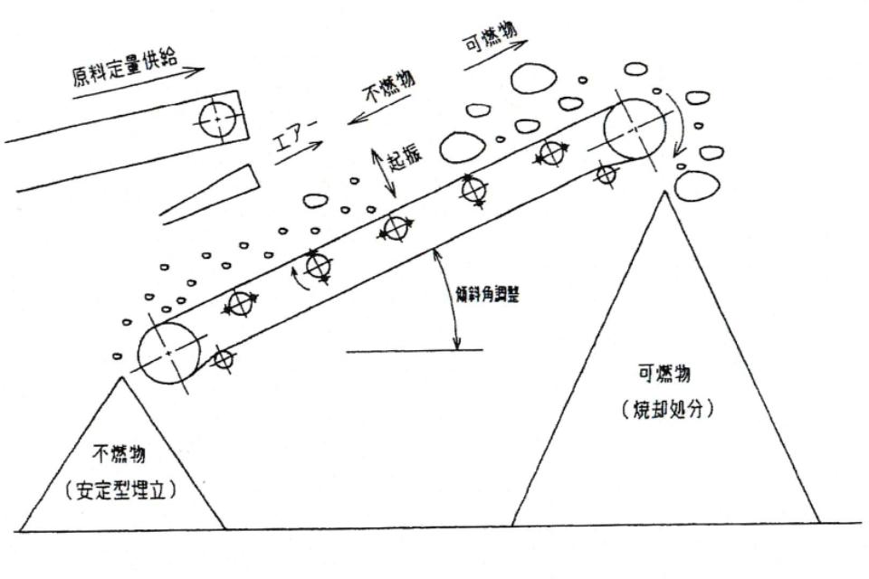 ベルトコンベヤの、後部に供給される原料に向かってエアーを噴出し、選別効果を高める。又傾斜角度が、容易に調整でき、原料の状態に合わせてより選別効果を高める。