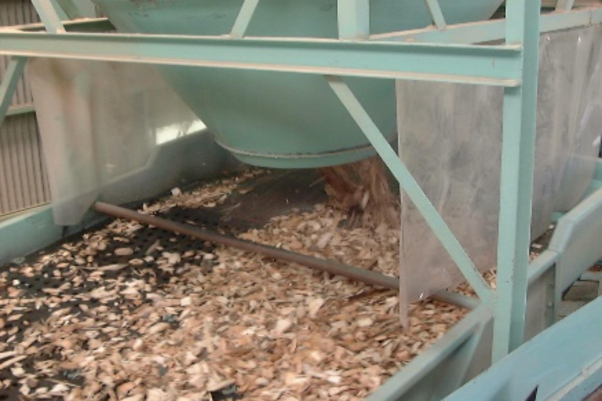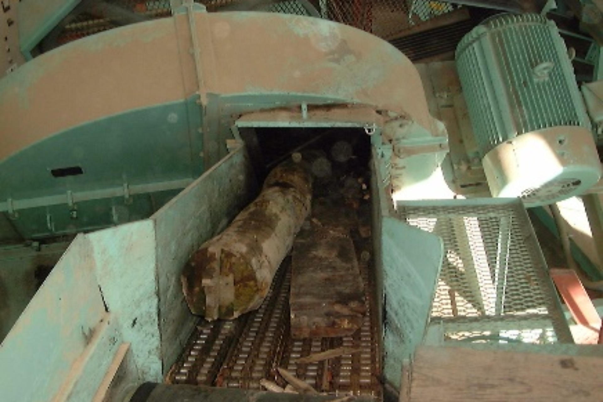 廃木材が木材チップとして加工されるまでの製造工程です。破砕機、振動コンベヤ、磁選コンベヤ、破砕機、ローラースクリーンなどの生産ラインを経て燃料チップ・ダストチップとして資源化されます。